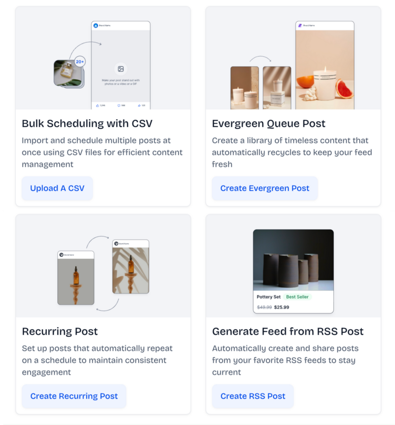 Bulk upload, queue evergreen content, or repeat posts automatically for ongoing campaigns. It’s efficient, organised, and totally client-proof.