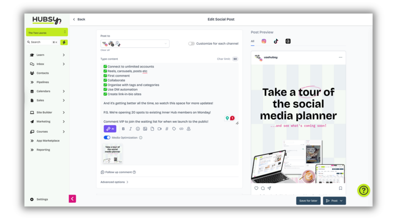 Whether it’s Reels, carousels, or static posts, Hubsy makes creating and scheduling feel effortless across every platform.