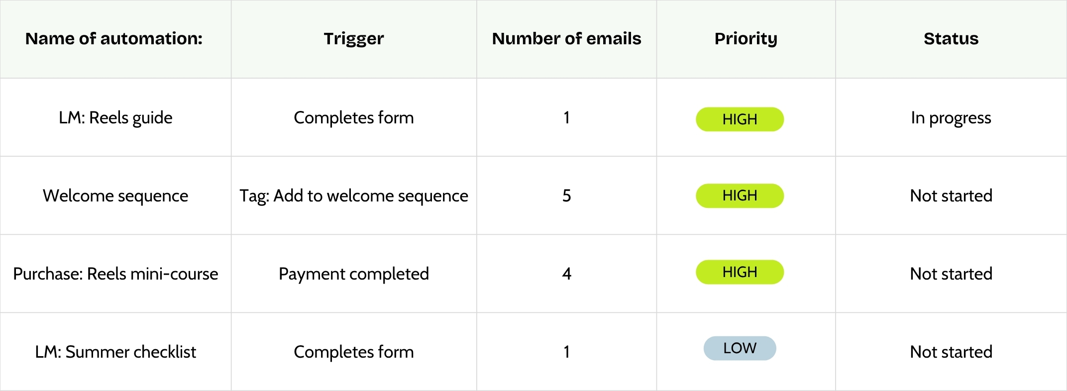 Then list them in order of priority (the automations you need immediately being highest). Start with your most active or income-generating workflows first, usually your lead magnet delivery or welcome sequence.