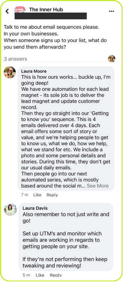 “The Inner Hub has given me a huge amount of confidence in my skills and the value of my services. I don't undercharge anymore, and I have become much better at pre-qualifying clients and spotting red flags. I don't say yes to things I don't want to do. I have backup from The Two Lauras now.”